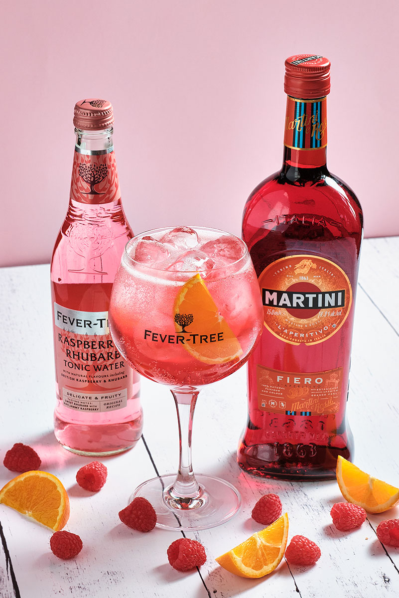 RASPBERRY & RHUBARB Tonic WaterMartini Fiero er en moderne vermouth, der fungerer som den perfekte aperitif, når den blandes med tonic. Her mixet med Fever-Tree Raspberry & Rhubarb Tonic Water, hvor drinken bibeholder sine smukke lyserøde nuancer.